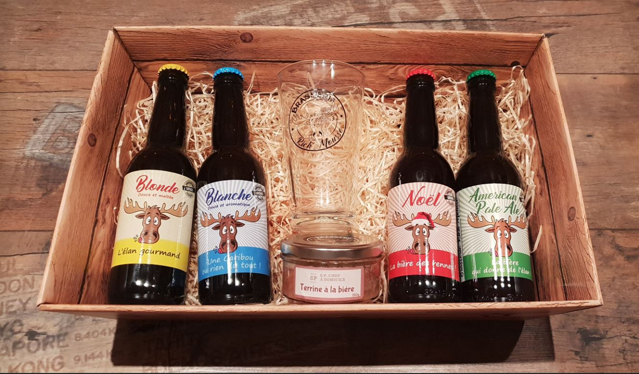 Ingrédients : - 4 bouteilles de bières 33cl microbrasserie RICH'MOUSSE (57) dont une bière de Noël (verre français Verallia, étiquette Moselle, confectionnées en Lorraine)