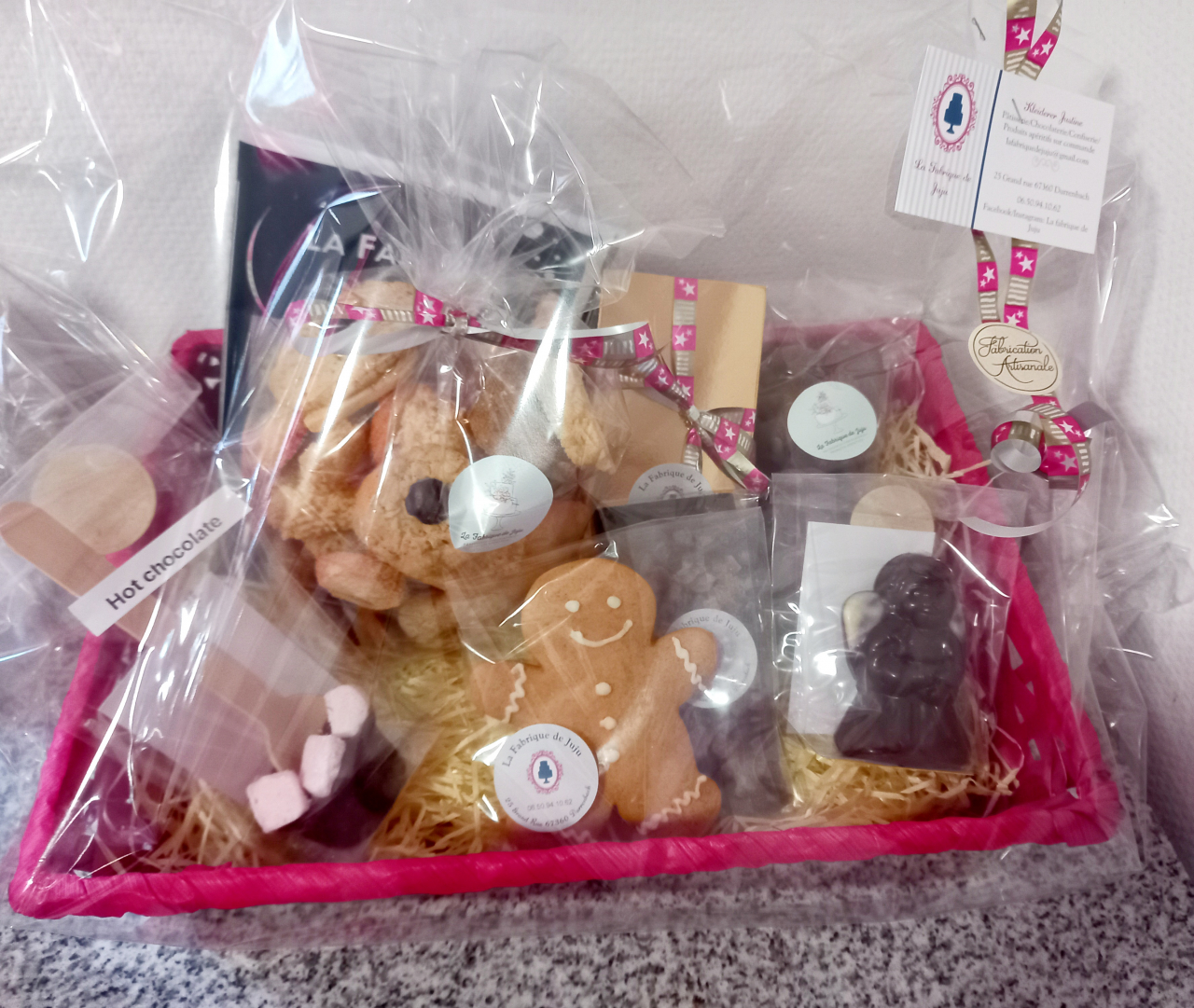 Panier garnie avec 500g bredele, 1 moulage ange, 125g de guimauve, 1 pain épice, 1 hot chocolate, 1 tablette de chocolat, 1 ballotin de chocolat.