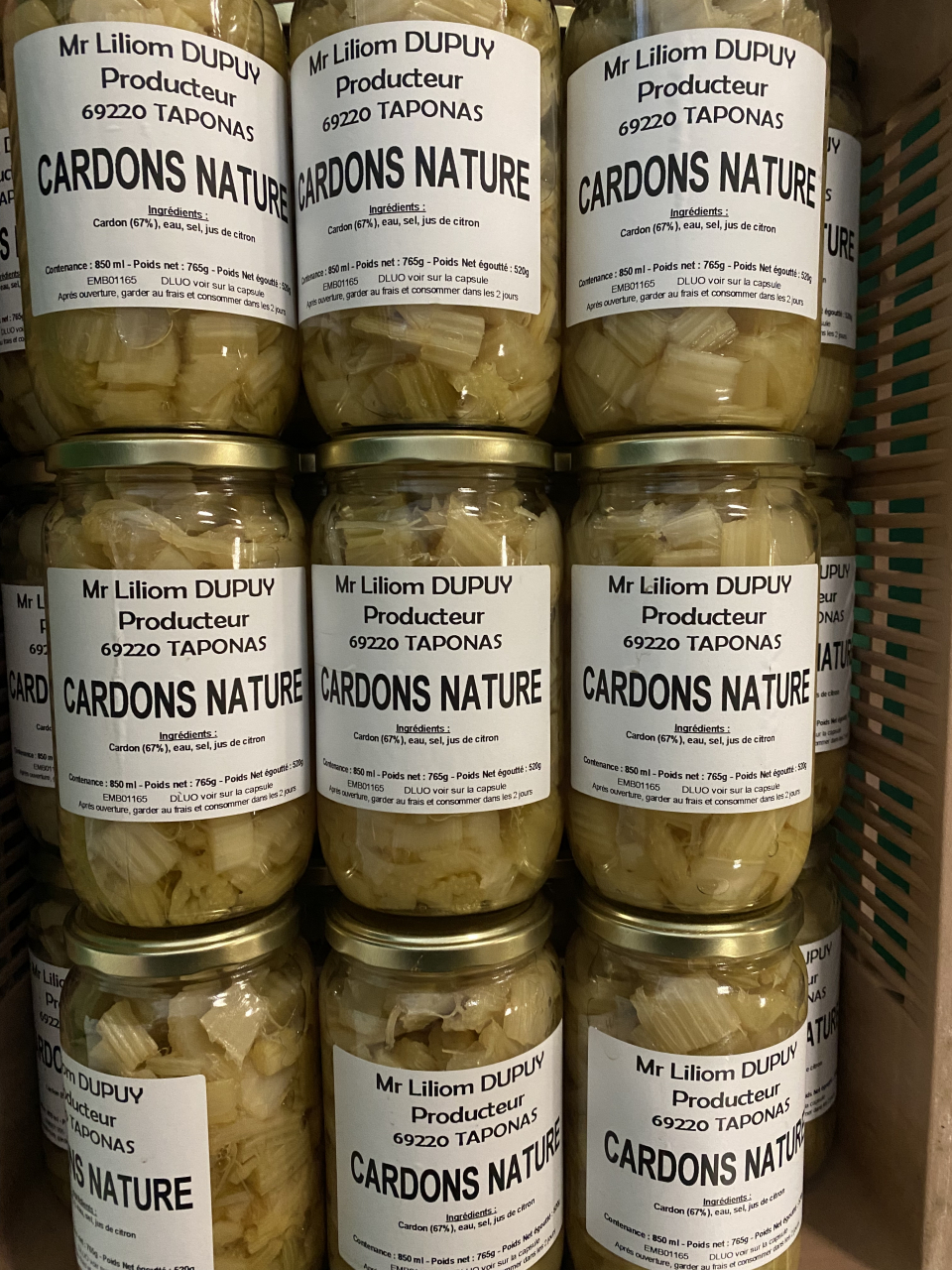 Cardons blanchis naturellement, effilés, cuits et stérilisés. Prêt à savourer . Grand pot de 850ml , net egouté : 520gr, sel et jus de citron. (environ 50% du prix pour les frais de conserverie : effilage, découpe, cuisson, mise en pot , stérilisation, étiquetage, mise en carton)