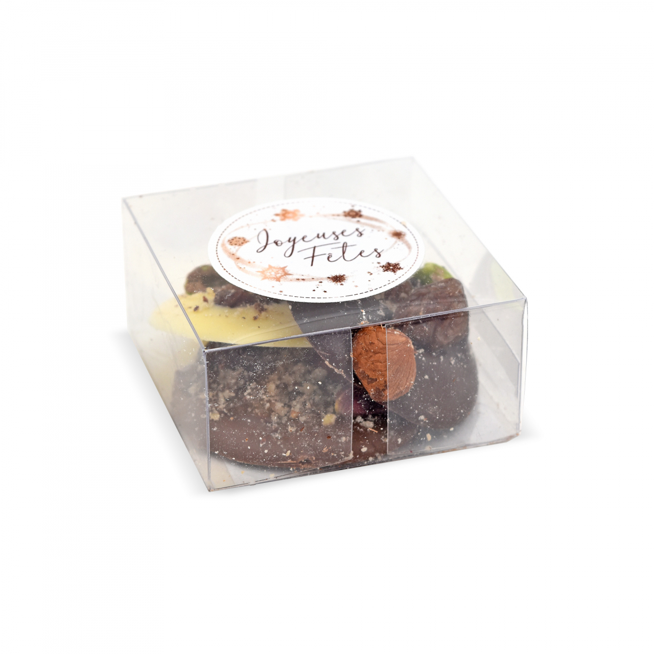 Une petite boîte contenant 3 mendiants assortis (palets de chocolats incrustés de fruits secs)