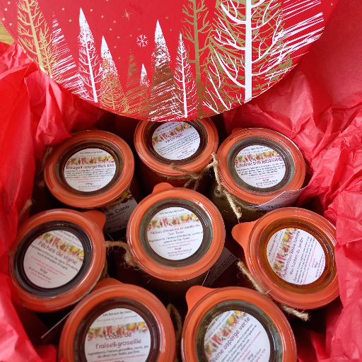 Dedans, enveloppés dans du papier de soie rouge, 8 bocaux assortis en 220ml (7 bocaux) et 165ml (1 bocal):