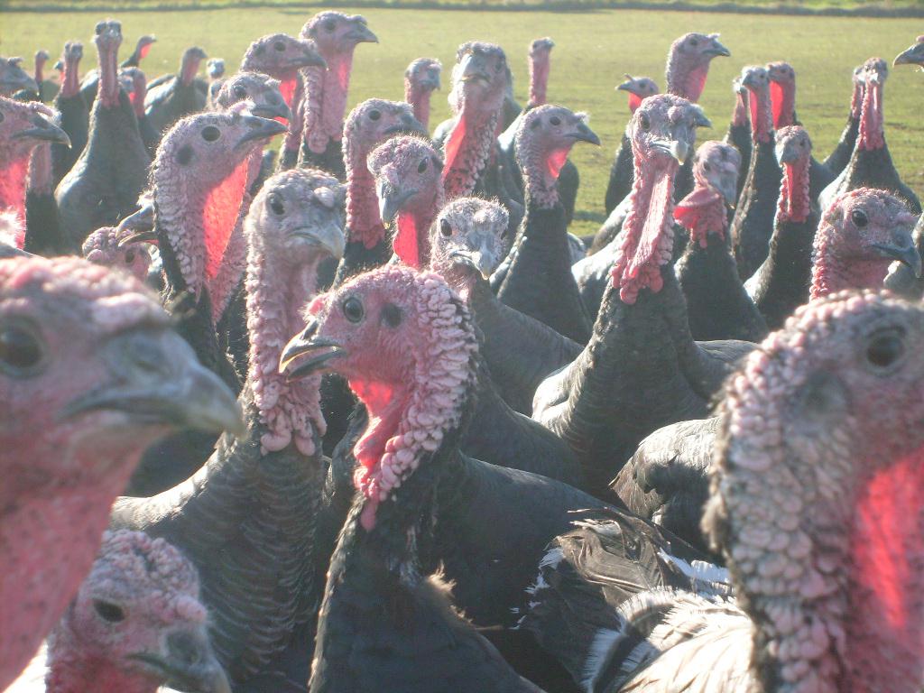 Dindes arrivées à la ferme à 1 jour au mois de mai. Elevées aux céréales de la ferme et en plein air.