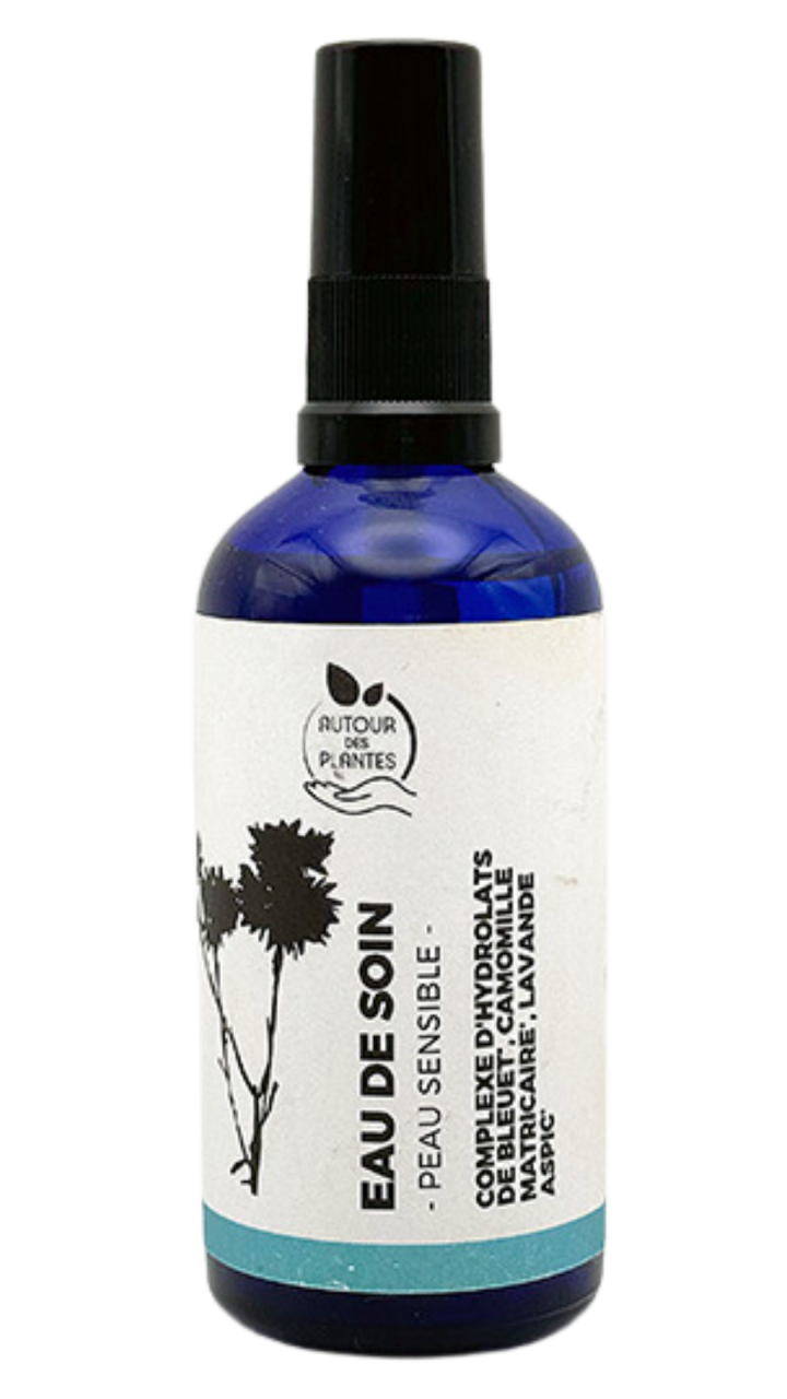 Cette eau de soin est composée d'hydrolats de Bleuet, Camomille matricaire, Lavande aspic pour leurs propriétés apaisantes, astringentes et anti-inflammatoire.