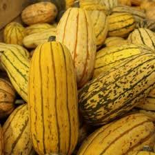 La courge Sweet Potato aussi appelée courge Delicata,. La chair de la courge delicata ou sweet potato est de couleur blanc crème, légèrement farineuse, délicieuse cuite, sa saveur rappelle celle de la noisette et châtaigne. Utilisations : En potage, gratin, purée, soufflé, gâteau