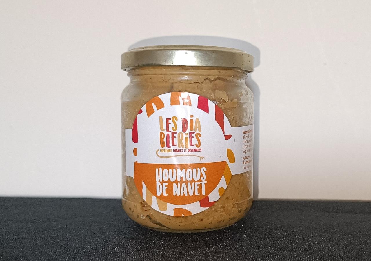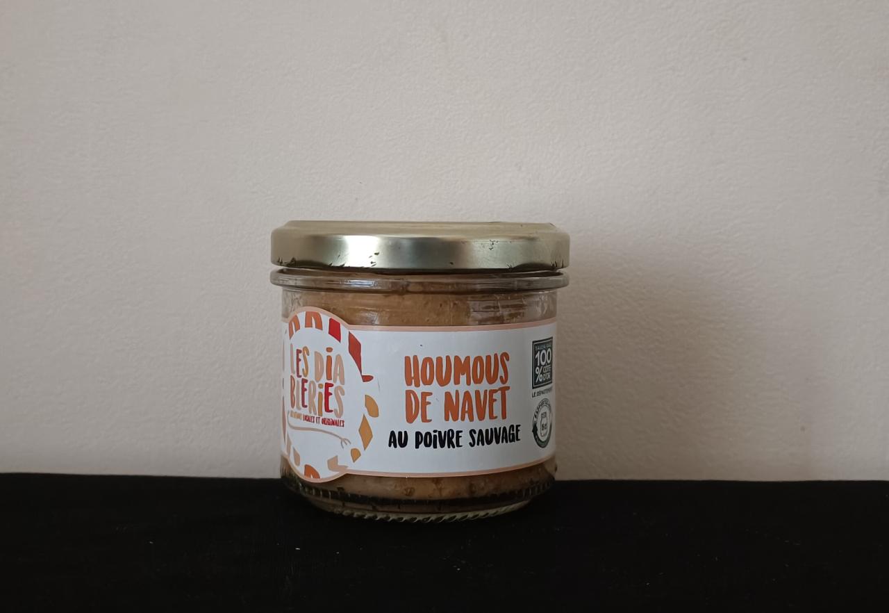 Allergènes : Peut contenir des traces de moutarde, de gluten, de fruits à coque et de celeri. Ingrédients : navet (51%), pois chiches,jus de citron, huile d'olive, ail, sel, épices, dont poivre voatsiperifery (0,2%).