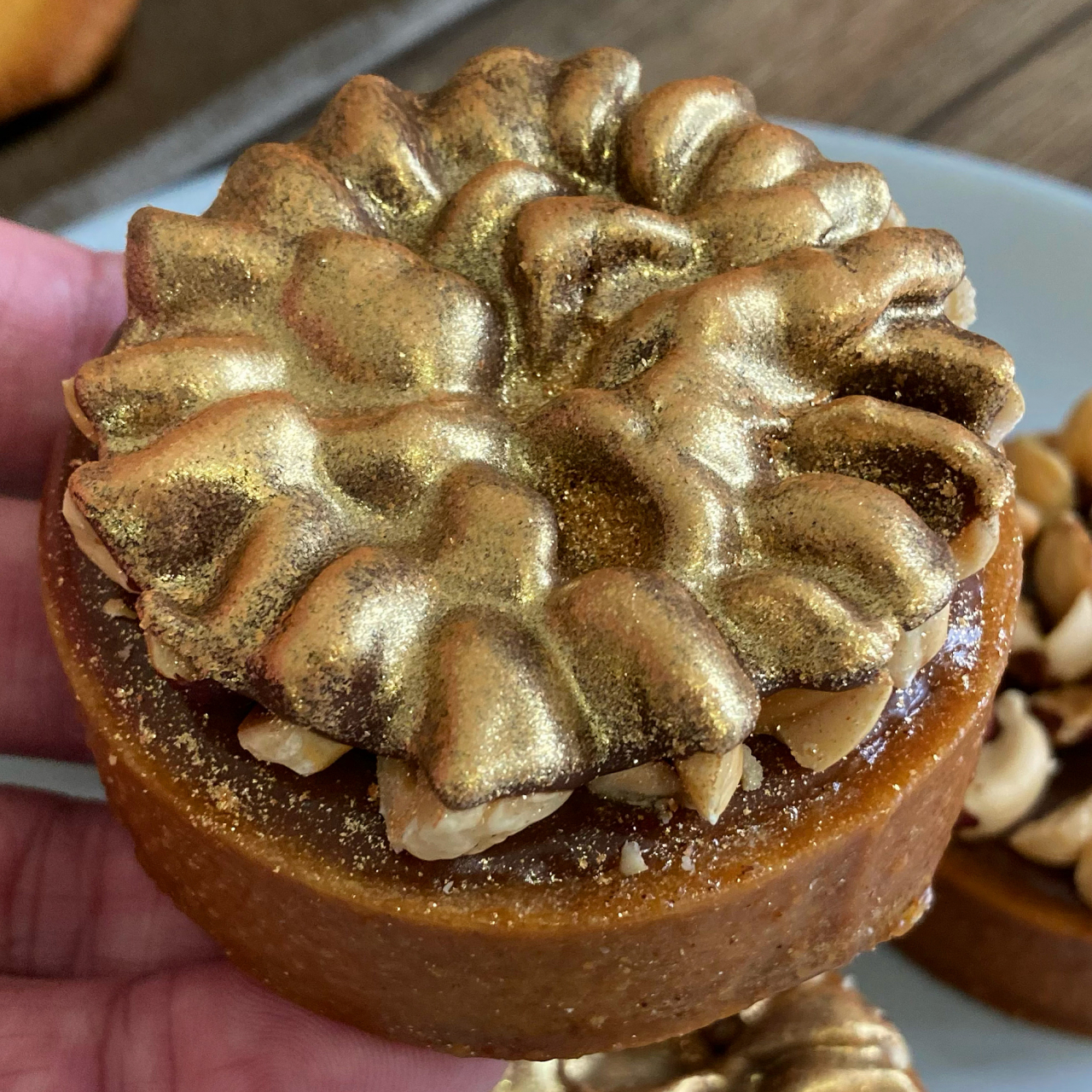 Cette tarte signature Gianduja est composé d'une pâte sucrée, d'un praliné noisette, d'une ganache Gianduja, de noisettes torréfiées.