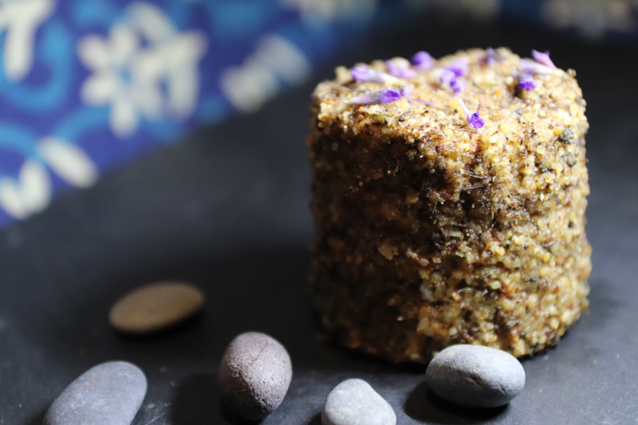 Fromage frais, enrobé d'amandes torréfiées et de lavande.