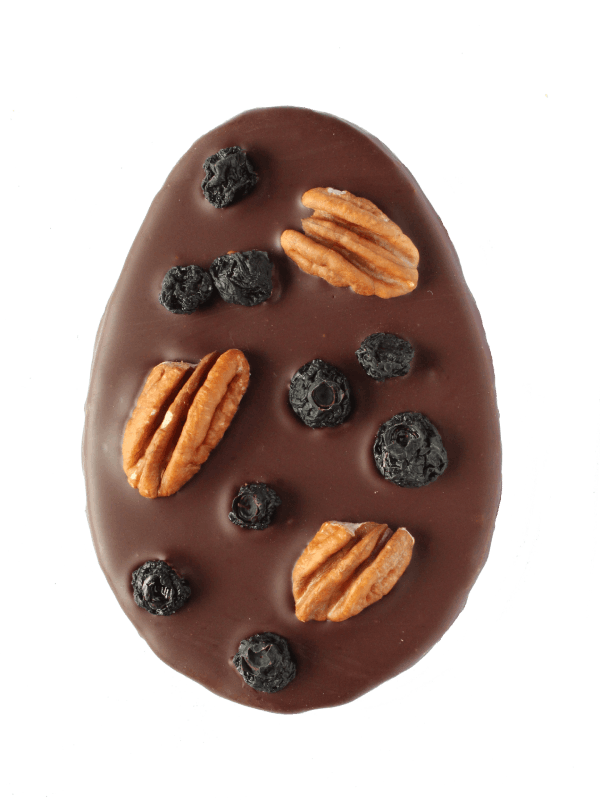 Ingrédients : Praliné noix de pécan et amandes 41 % (sucre, noix de pécan du Lot-et-Garonne et amandes de la Drôme), chocolat noir (pâte de cacao de São Tomé-et-Principe, sucre, beurre de cacao, émulsifiant : lécithine de soja), chocolat au lait (sucre, beurre de cacao, lait en poudre, pâte de cacao de São Tomé-et-Principe, émulsifiant : lécithine de soja), myrtilles de Corrèze, noisettes du Lot-et-Garonne