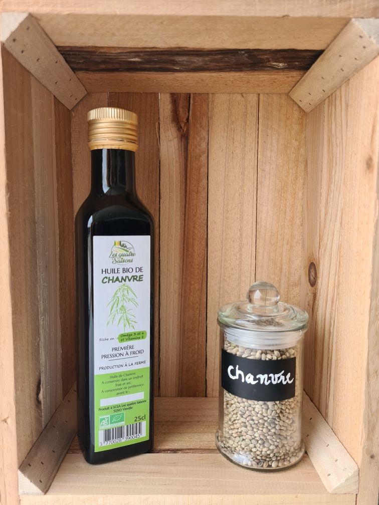 Conditionnement : bouteille en verre 250ml Durée de conservation : 1 an minimum si non ouvert et conservée à l'abri du chaud et de la lumière/ 6 mois au frigo après ouverture Ingrédients : Huile de chanvre Origine : Haute-Marne