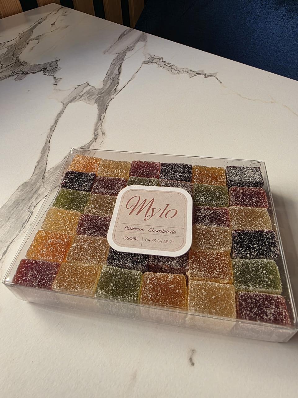 Nos pâtes de fruits sont réalisées à base de pulpe de fruits, sucre, glucose, pectine et acide citrique.