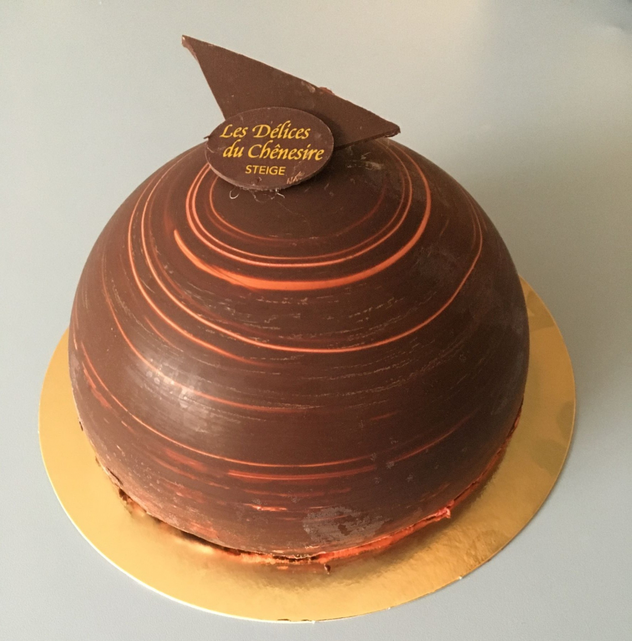 Dôme chocolat avec un sorbet mangue-passion dans un dôme chocolat de sorbet framboise avec du riz soufflé,