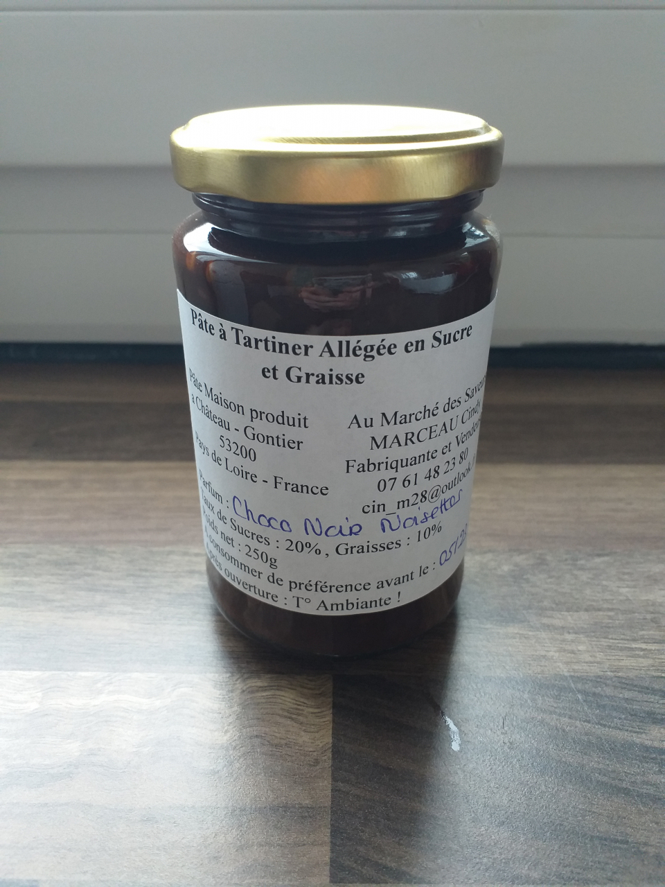 Pate a tartiner allégé en sucre et graisses (sucre 20%, graisses 10%), Chocolat noir avec du concassés de noisettes.