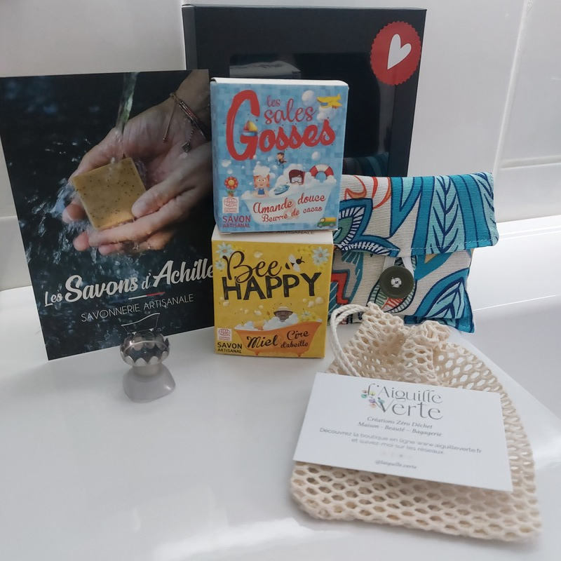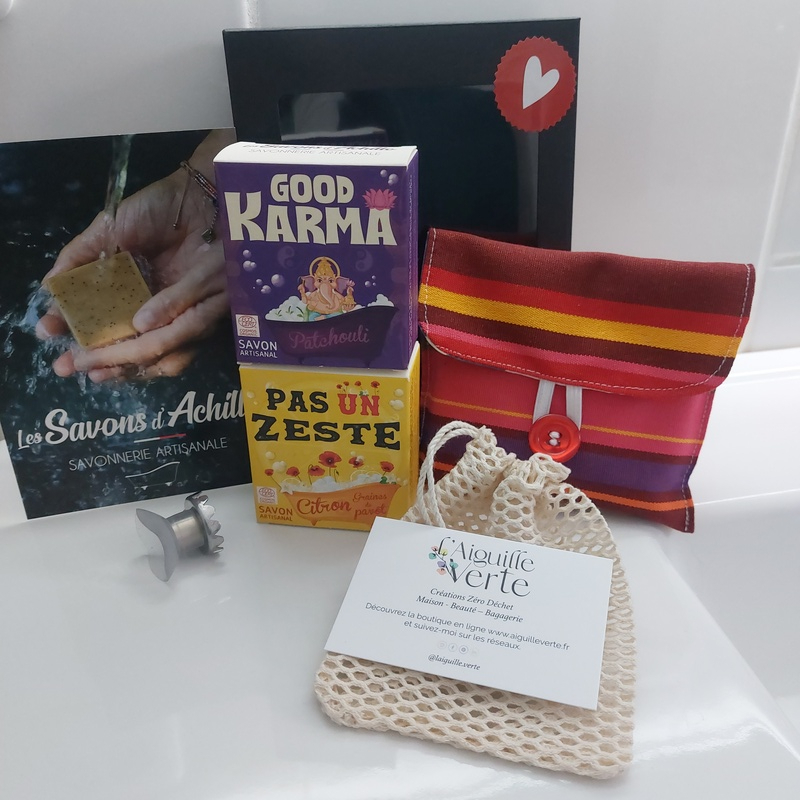 Issu du partenariat avec la savonnerie Les savons d'Achille, ce kit de démarrage des savons solides est composé de : 2 savons solides au choix, 1 filet Sauve savon, 1 pochette étui de rangement pour solide et 1 porte-savon ventouse aimanté. Le tout prêt à offrir dans une jolie boite à vitrine noire, chic et élégante.