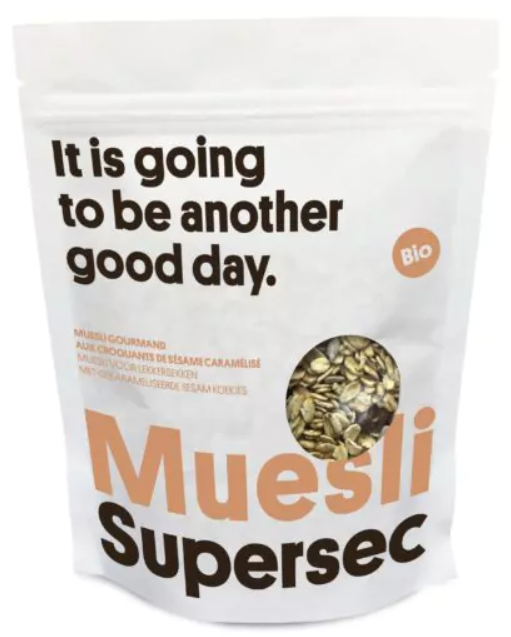 Ingrédients : Avoine*, croquants au sésame Supersec* (68% graines de sésame*, 10% miel*, sucre de canne*, glucose* et vanille*), noisettes*, graines de tournesol*, graines de courge* (*produits issus de l’agriculture biologique)
