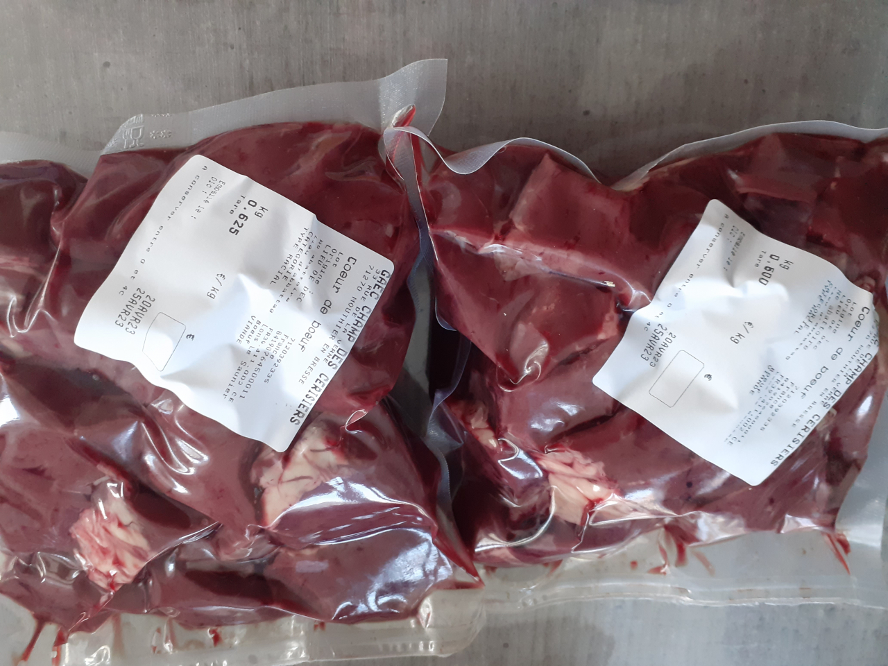 Cœur de bœuf coupé en cubes et emballé sous vide.