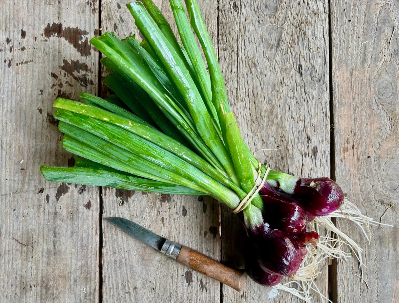 Nous proposons au printemps des bottes d'oignons rouge fraise 600gr soit 5-8 oignons.