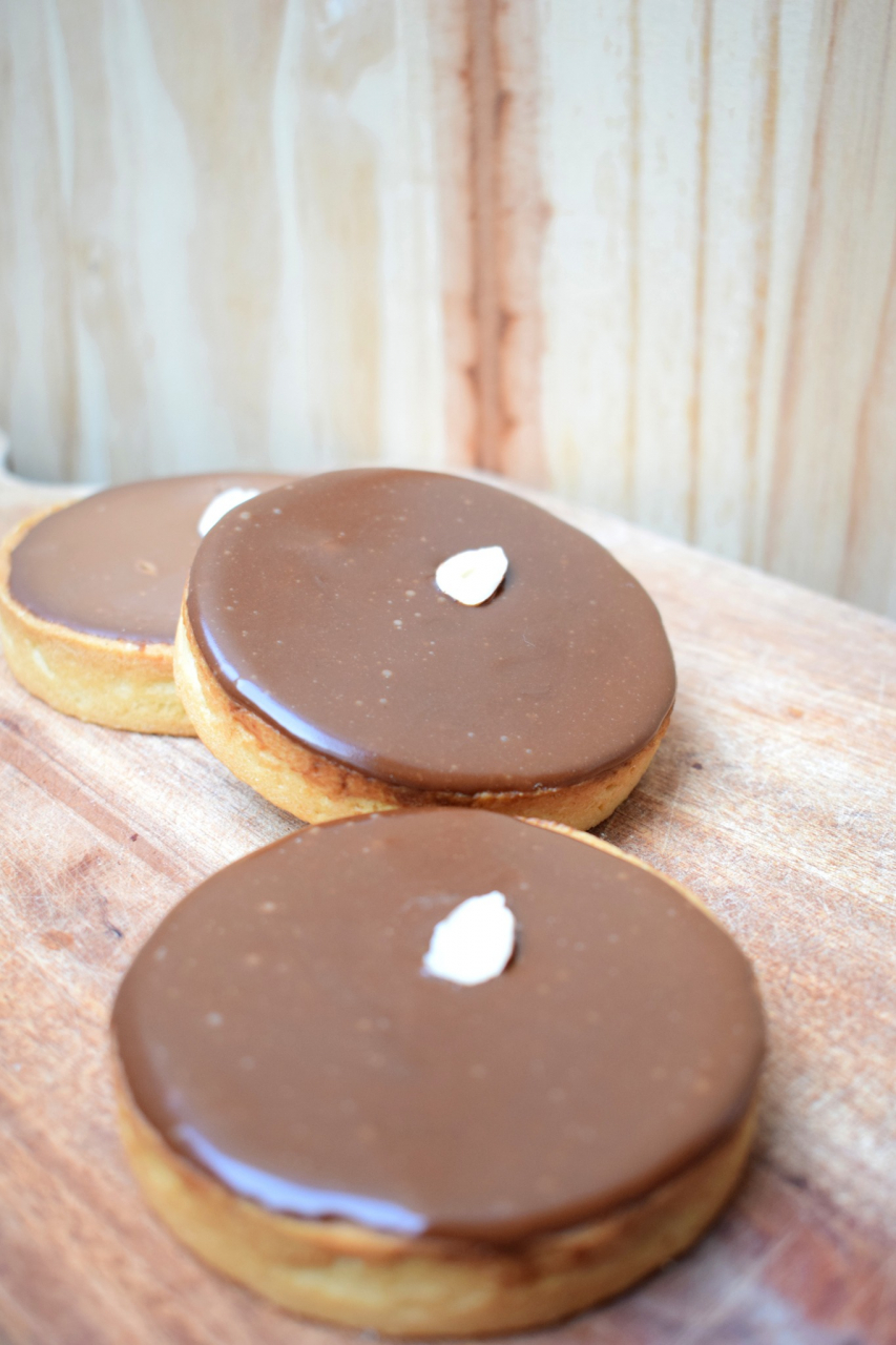 Une pâte sablée croustillante, des noisettes concassés, une ganache au chocolat,