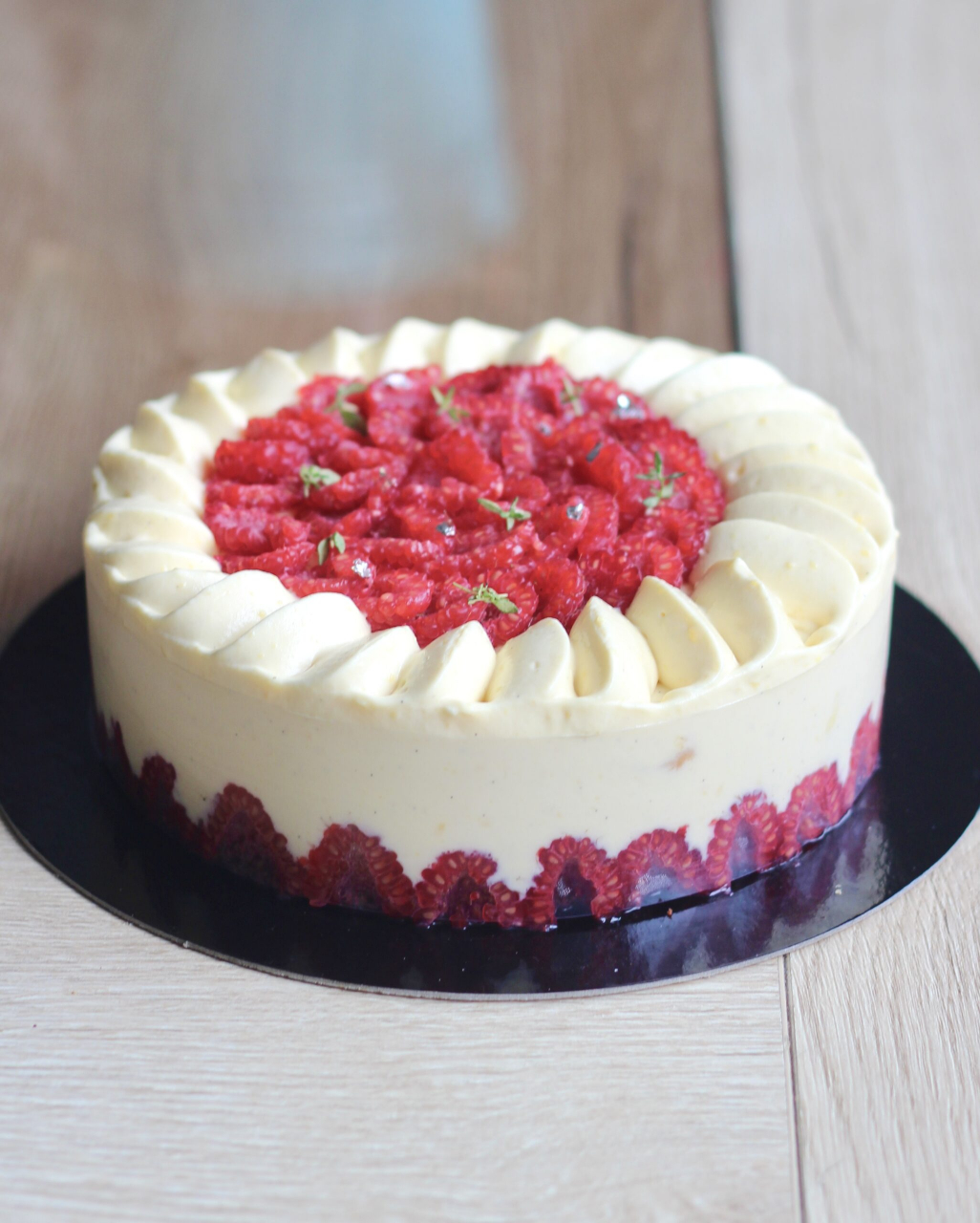 Composé d’une crème diplomate, d’une base de génoise imbibée, de framboises et d’une compotée de framboises.