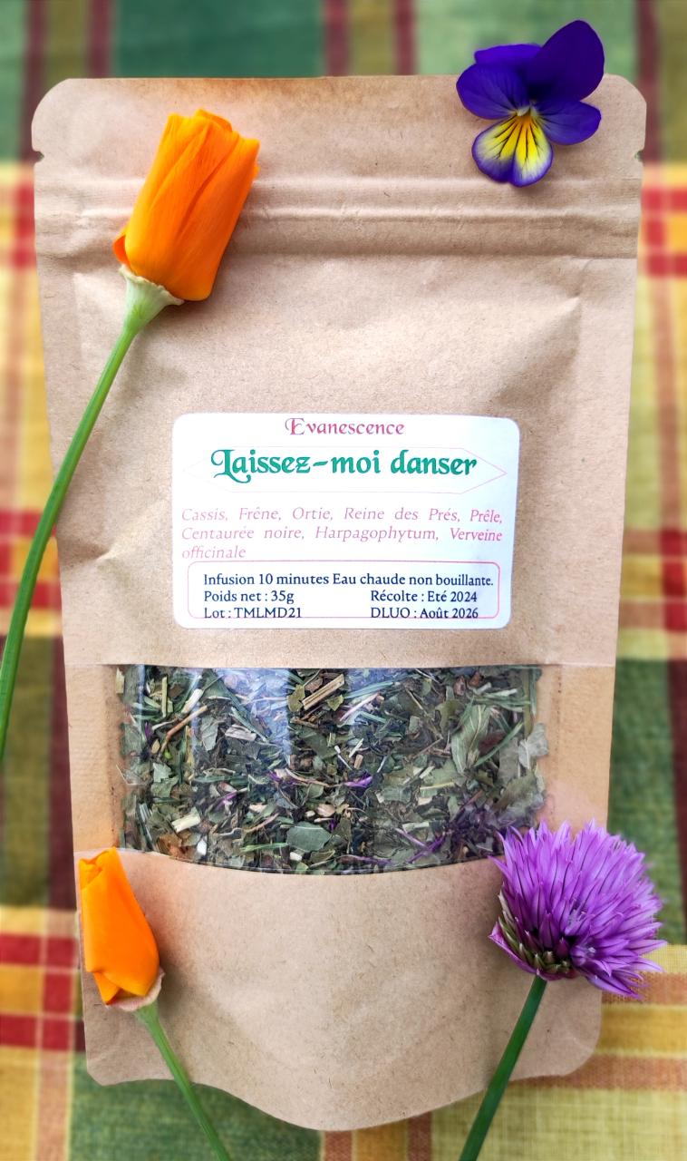 Infusion à base de plantes réputées pour apaiser les problèmes articulaires. Les plantes sont cueillies par mes soins issues de ma propre production ou de lieux de cueillette choisis avec soin. Le séchage et conservation dans une pièce au taux d'humidité contrôlée.