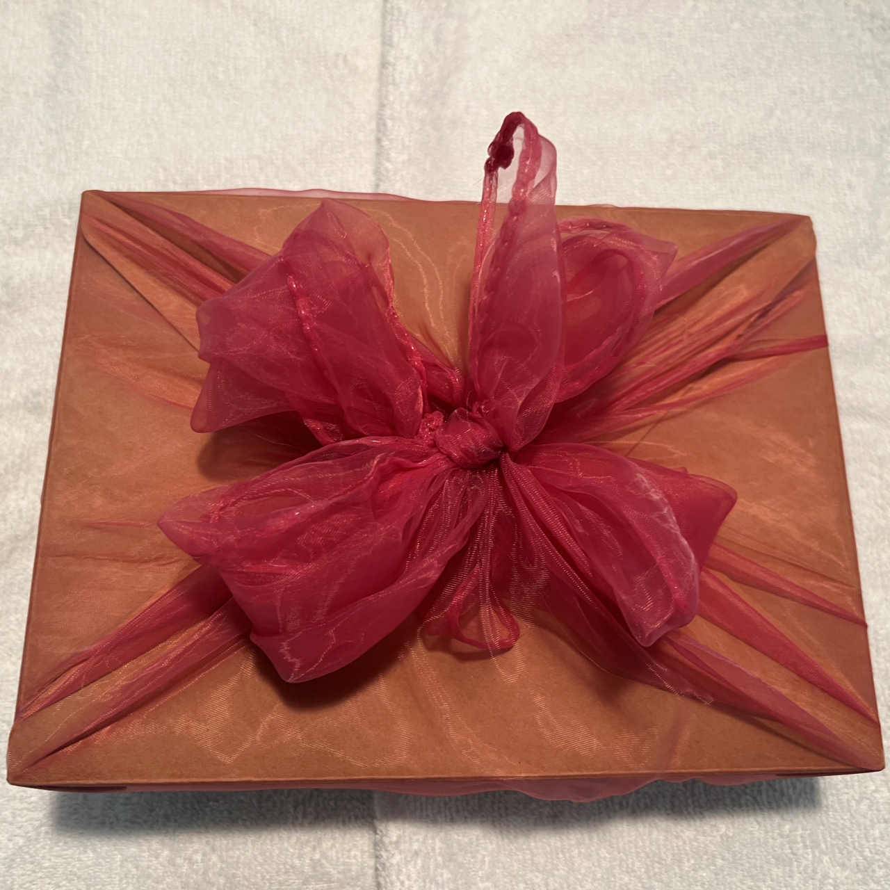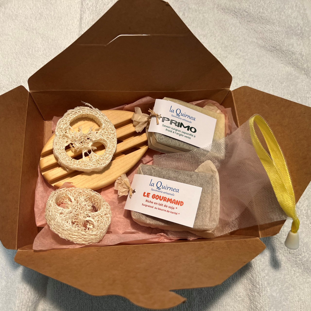 Coffret en kraft emballé avec un petit foulard de mousseline (réutilisable) composé de :
