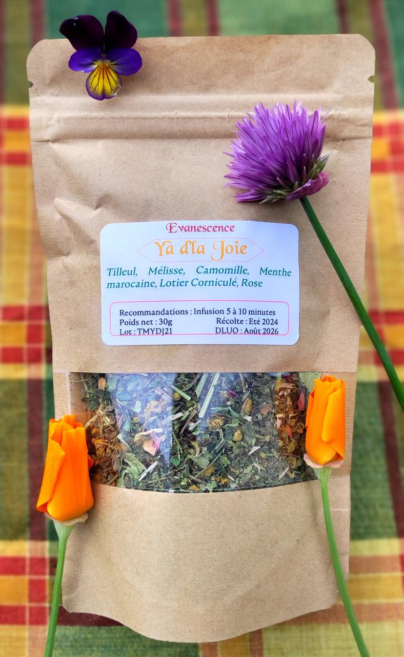 Infusion qui apportera une touche de bonne humeur et de détente à votre journée. A consommer chaude ou froide. Plantes cueillies par mes soins issues de ma propre production ou de lieux de cueillette choisis avec soin. Séchage et conservation dans une pièce au taux d'humidité contrôlée.