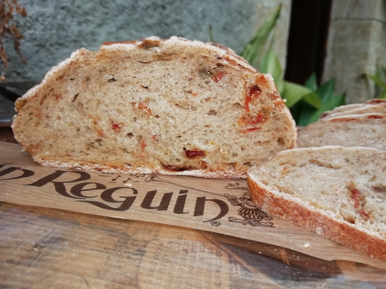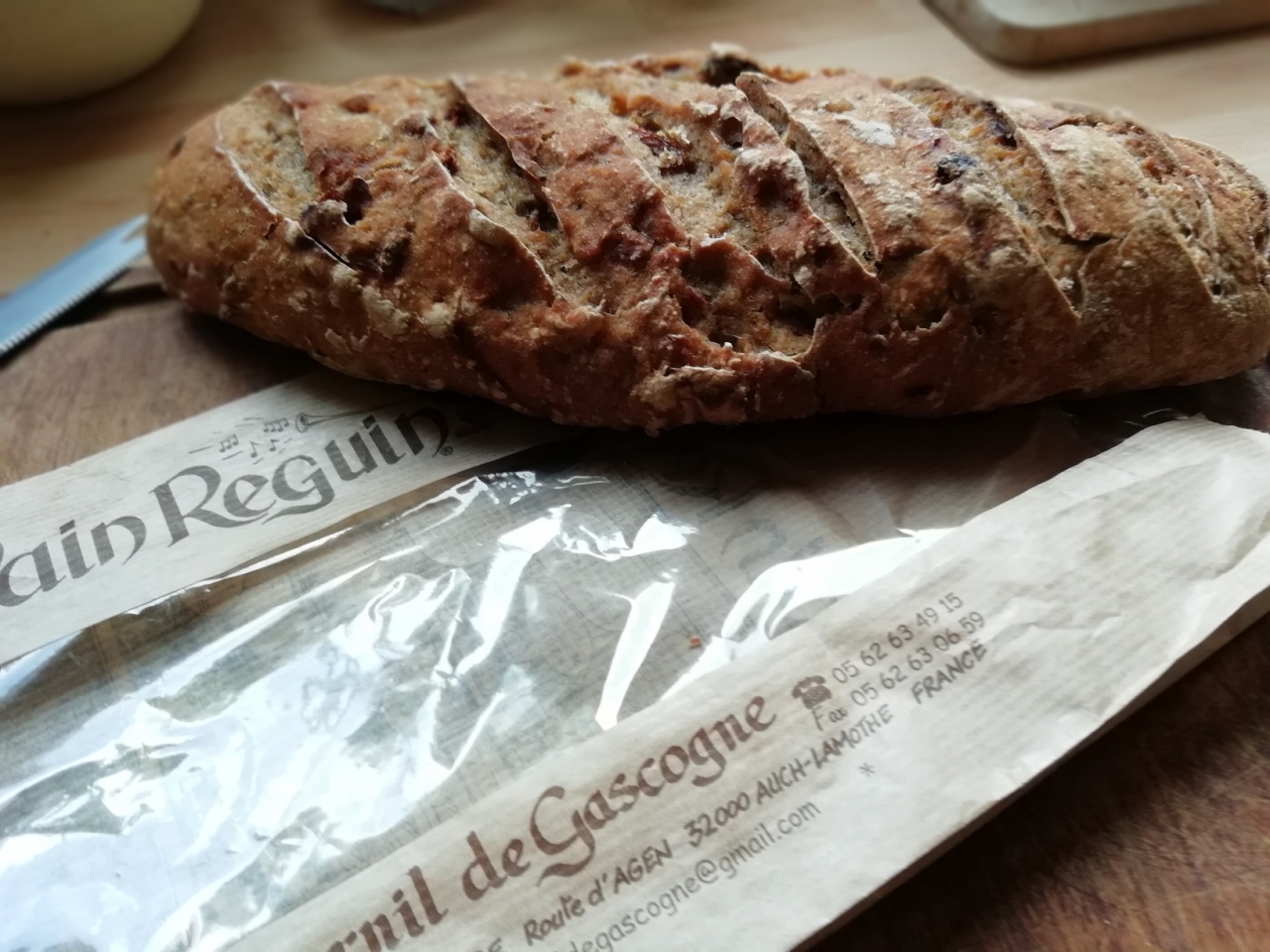 Le pain Crétois du Fournil de Gascogne est un pain demi complet gourmand avec une mie moelleuse à l'huile d'olive et enrichie de tomates séchées, d'olives vertes, d'oignons cuits et herbes de Provence.