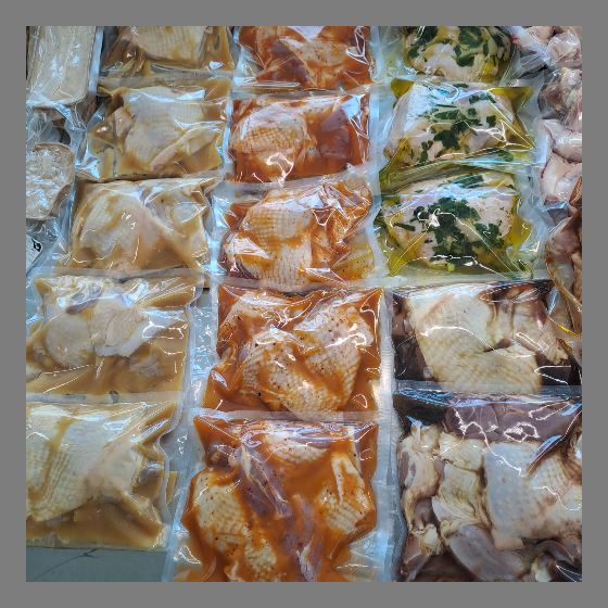 Conditionnement : sous vide Durée de conservation : 8 Ingrédients : Les marinades de poulet de la ferme d'illats sont créés et produites à la ferme. Cuisses désossées de poulet