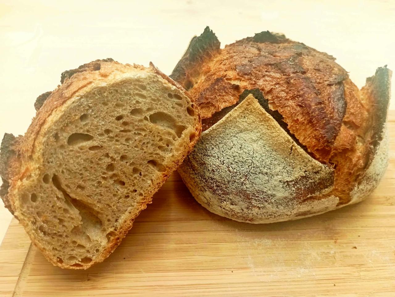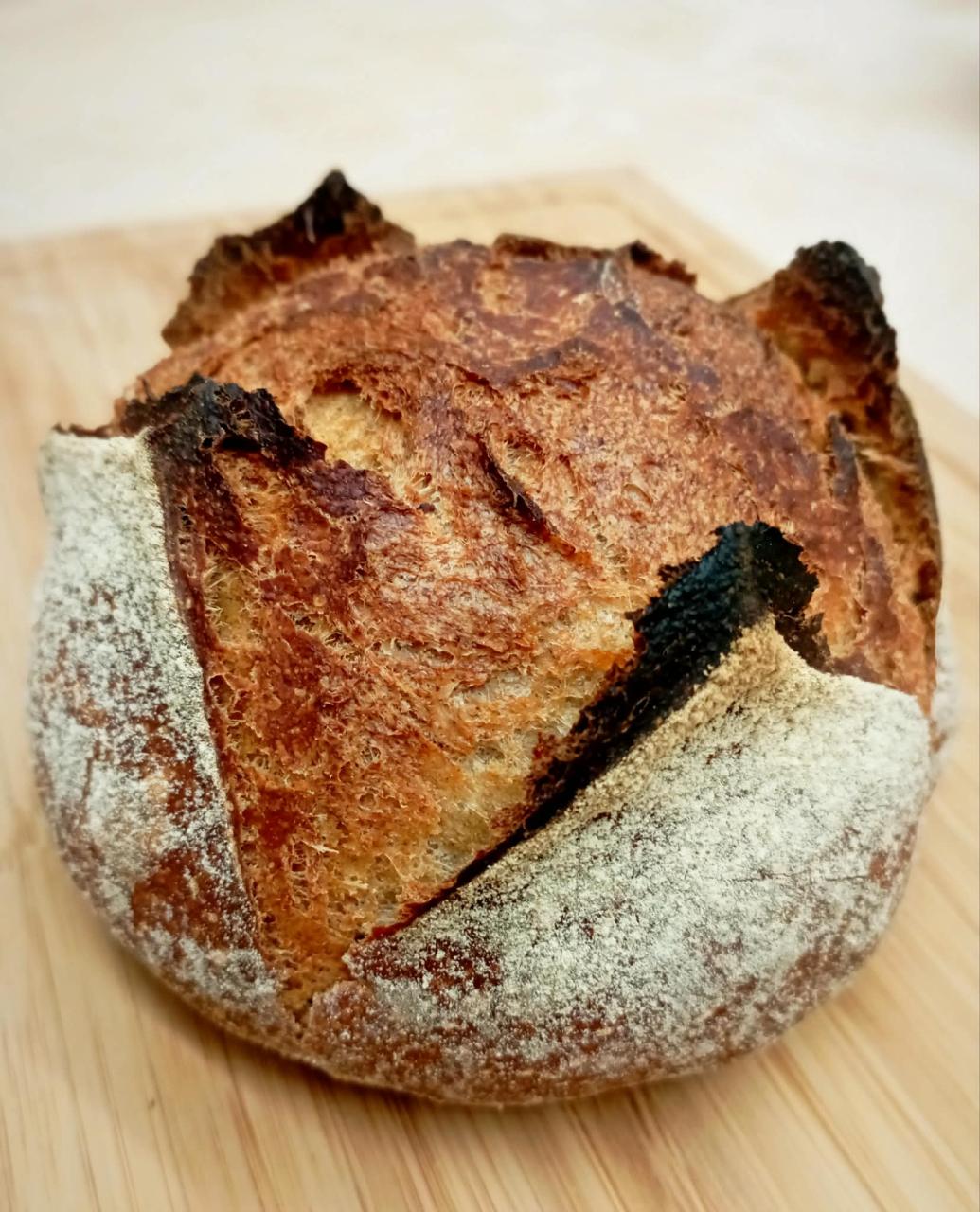 Pain riche en fibres, au levain naturel de seigle, en longue fermentation. Farine de blé complète T110, bio et moulue sur meule de pierre. Pain à la croute épaisse avec une mie généreuse et assez dense. L'utilisation exclusive du levain et la fermentation longue nous donnent un pain plus digeste qui se garde longtemps.