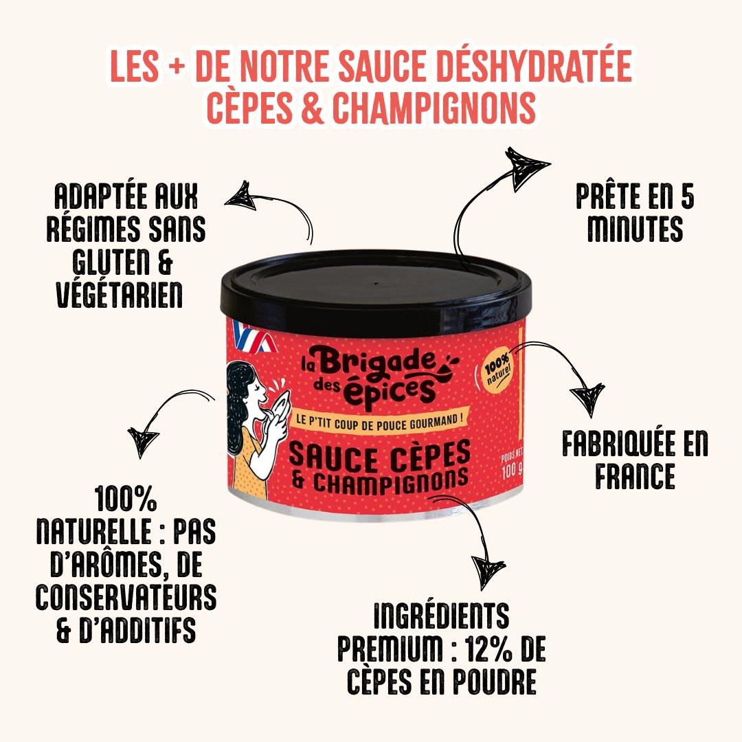Testez notre sauce déshydratés aux cèpes et champignons sauvages pour accompagner vos plats du quotidien.