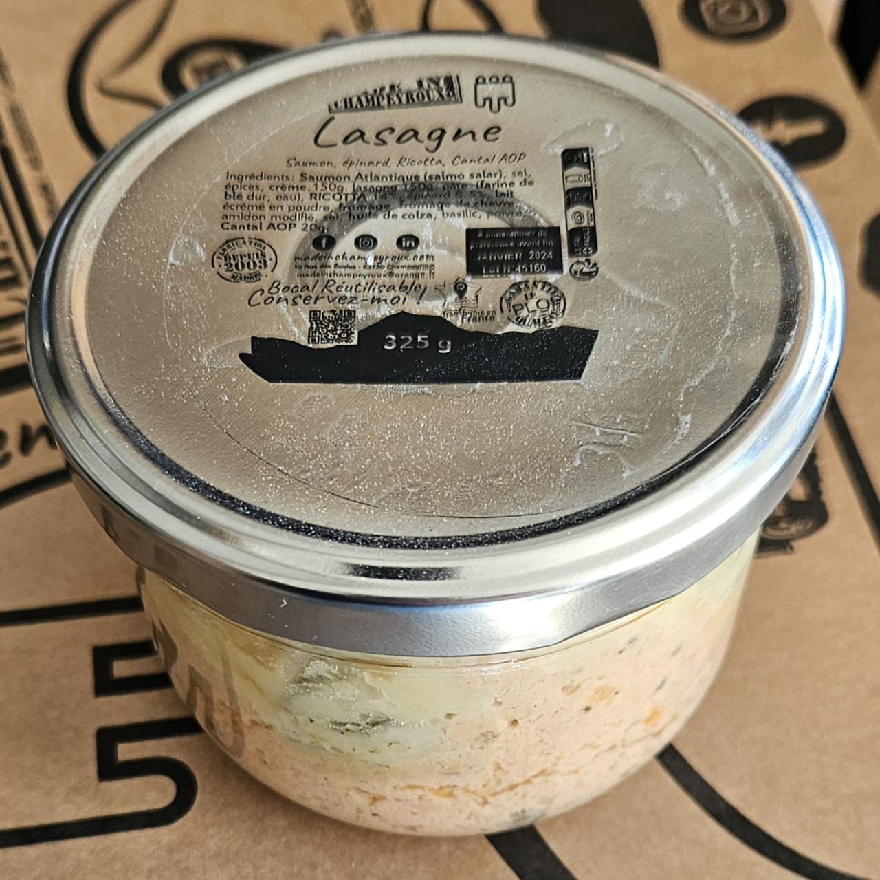 Ingrédients: Saumon Atlantique (salmo salar), sel, épices, crème.150g. lasagne 150g: pâte: (farine de blé dur, eau), RICOTTA 14%, épinard 8.5%, lait écrémé en poudre, fromage, fromage de chèvre, amidon modifié, sel, huile de colza, basilic, poivre; Cantal AOP 20g.