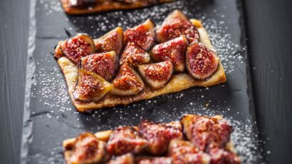 Sur une pâte feuilletée est posée une fine couche d'une délicieuse compote, sur laquelle on ajoute des rangées de figues bien mûres.