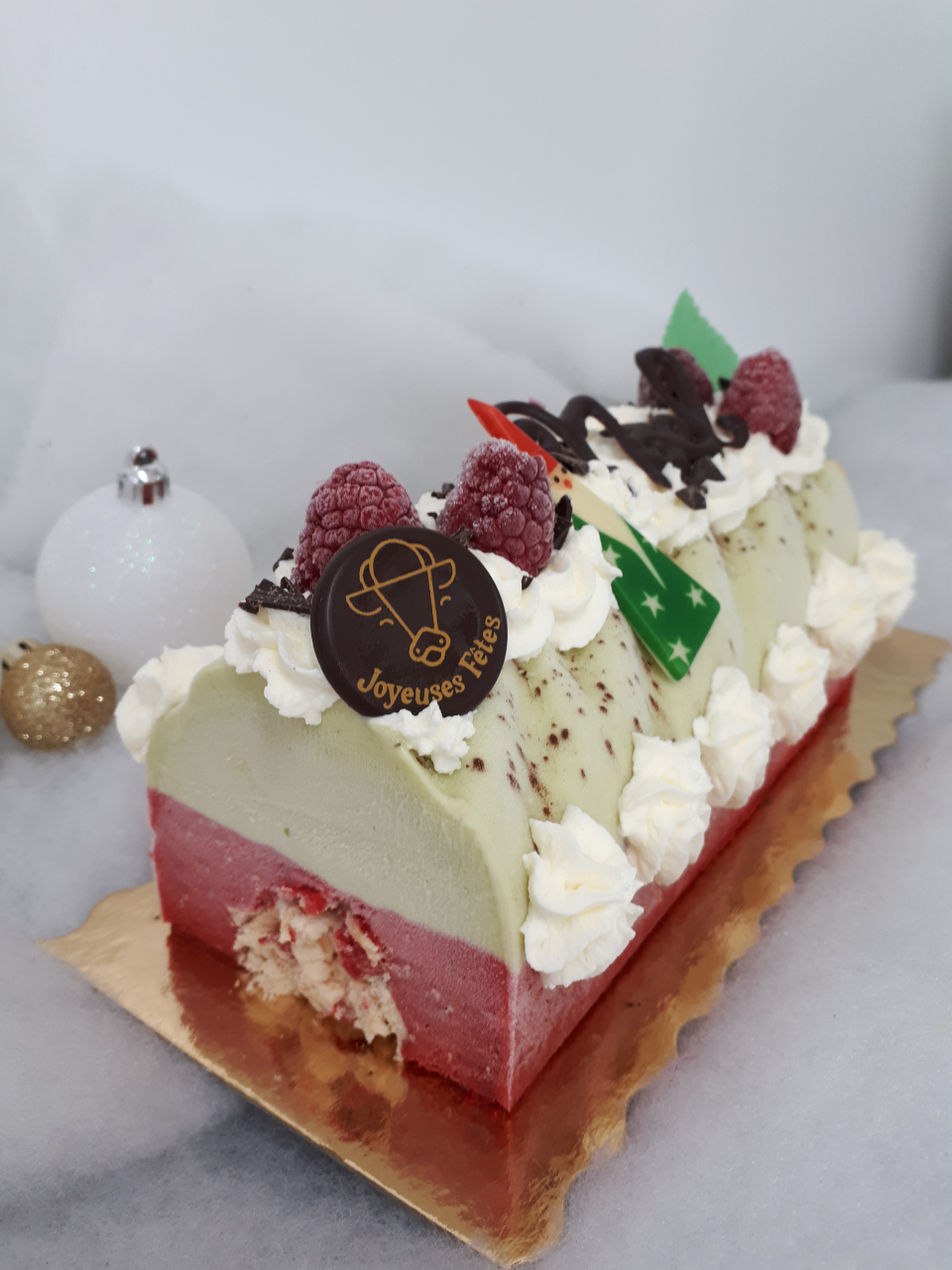 Bûche glacée avec Glace Pistache et Sorbet Framboise, fourrée à la meringue