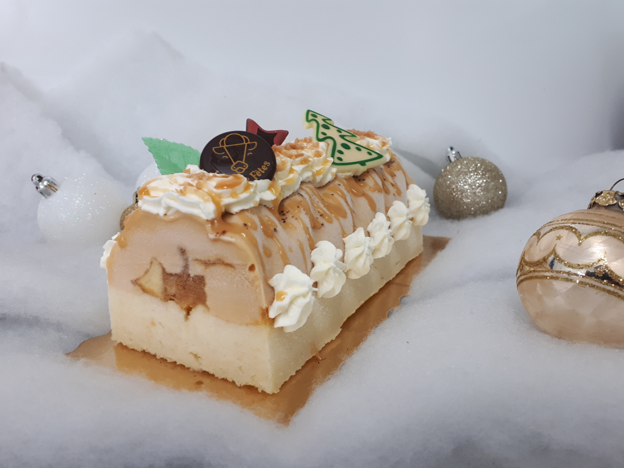 Bûche glacée avec Glace Caramel beurre salé et sorbet Pomme, fourrée avec des morceaux de pommes caramélisées