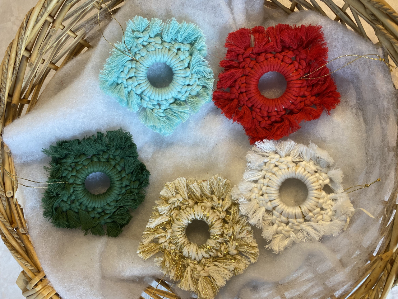 5 flocons de neige en macramé à suspendre ou à poser sur une table . 5 couleurs différentes vert,rouge,turquoise,blanc et doré