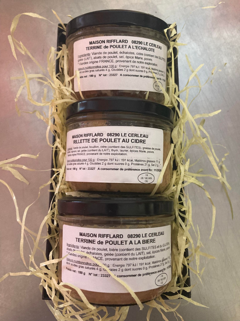 coffret de noël composé d'une terrine de poulet à l'échalote , une rillette de poulet au cidre de Lalobbe et une terrine à la bière de Monthermé. chaque pot fait 180 g