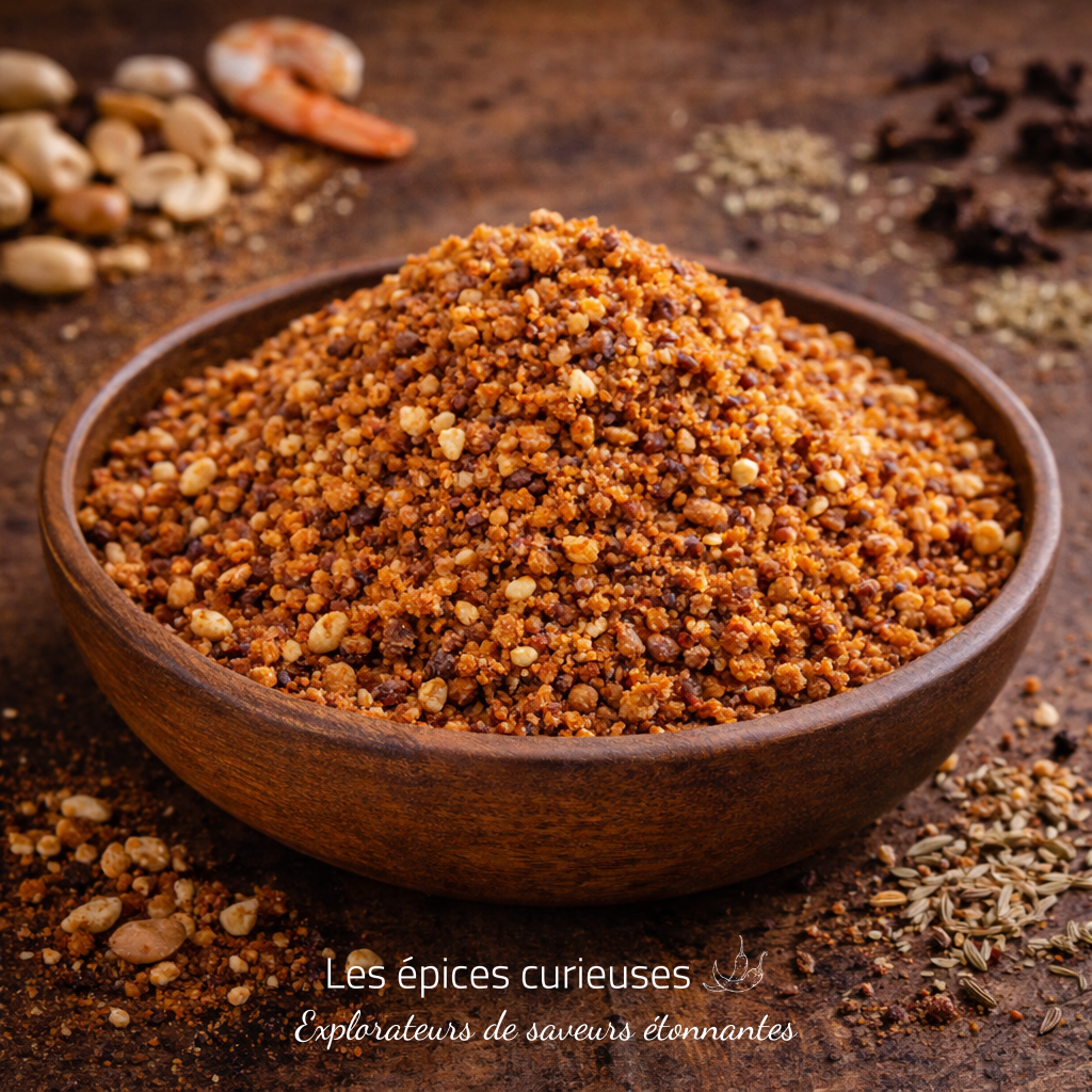 Ingrédients : ARACHIDE, SESAME, sucre roux, paprika, CREVETTE, ail, sel, fenouil, anis vert, gingembre, poivre noir, coriandre, cannelle, clou de girofle.