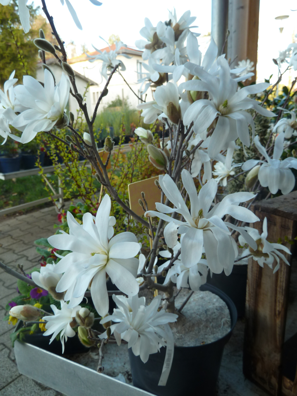 Magnolia arbustif à floraison blanche. Fleurs en forme d'étoile apparaissant en mars, avant les feuilles