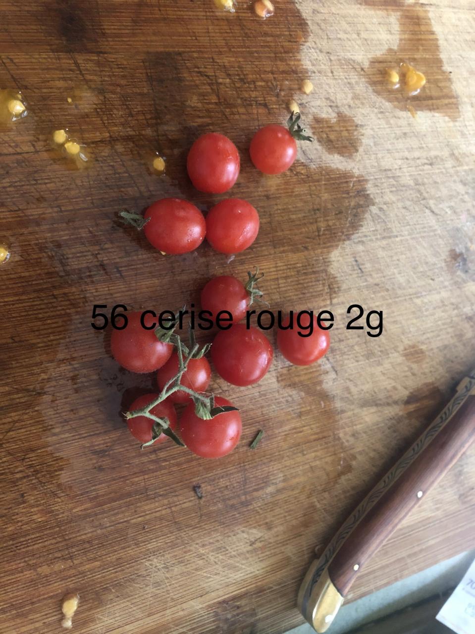 Petites tomates cerises rouges poussant en grappe. Elles ont poussé une année dans le jardin, un pied surprise. Elles viennent d’une année où nous avons échangé des variétés avec une amie. Mes premiers sachets sont de 2018.