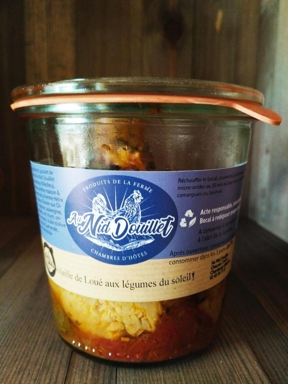 Conditionnement : bocaux Durée de conservation : jusqu'au 18.08.2025 Ingrédients : Poulet de Loué, tomate confite, poivron, oignon, aubergine, courgette, ail, thym, origan, romarin, huile d'olive, sel de Guérande, poivre du Kérala. Origine : France