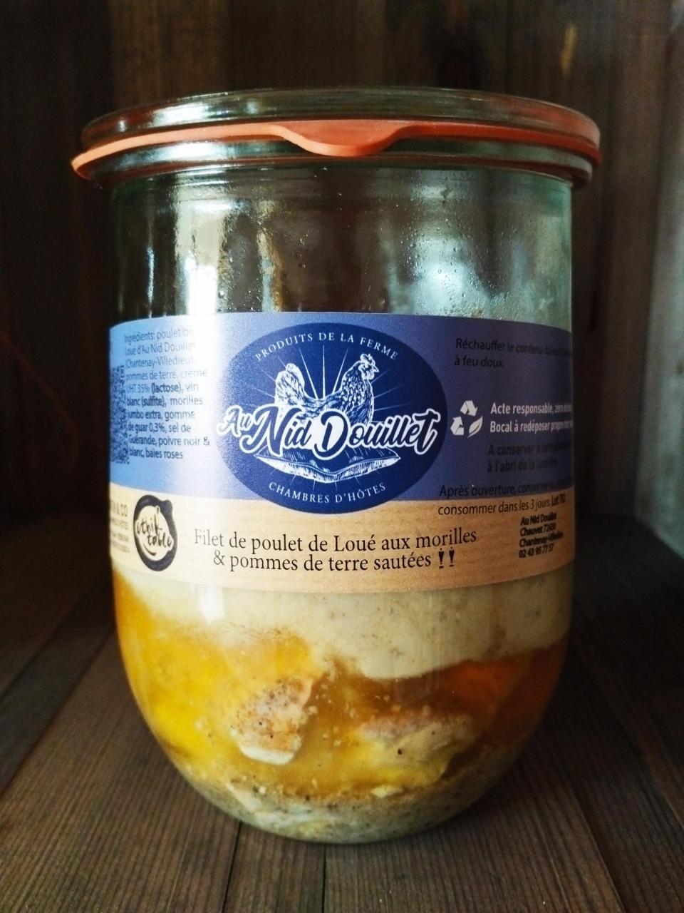 Filet de poulet de Loué aux morilles et pommes de terre vapeur pour 2 personnes, plats préparés par un chef cuisinier spécialiste en conserverie. Facile à réchauffer, 3 min au micro-ondes et plus qu'à déguster. Produits de qualité en toute rapidité.