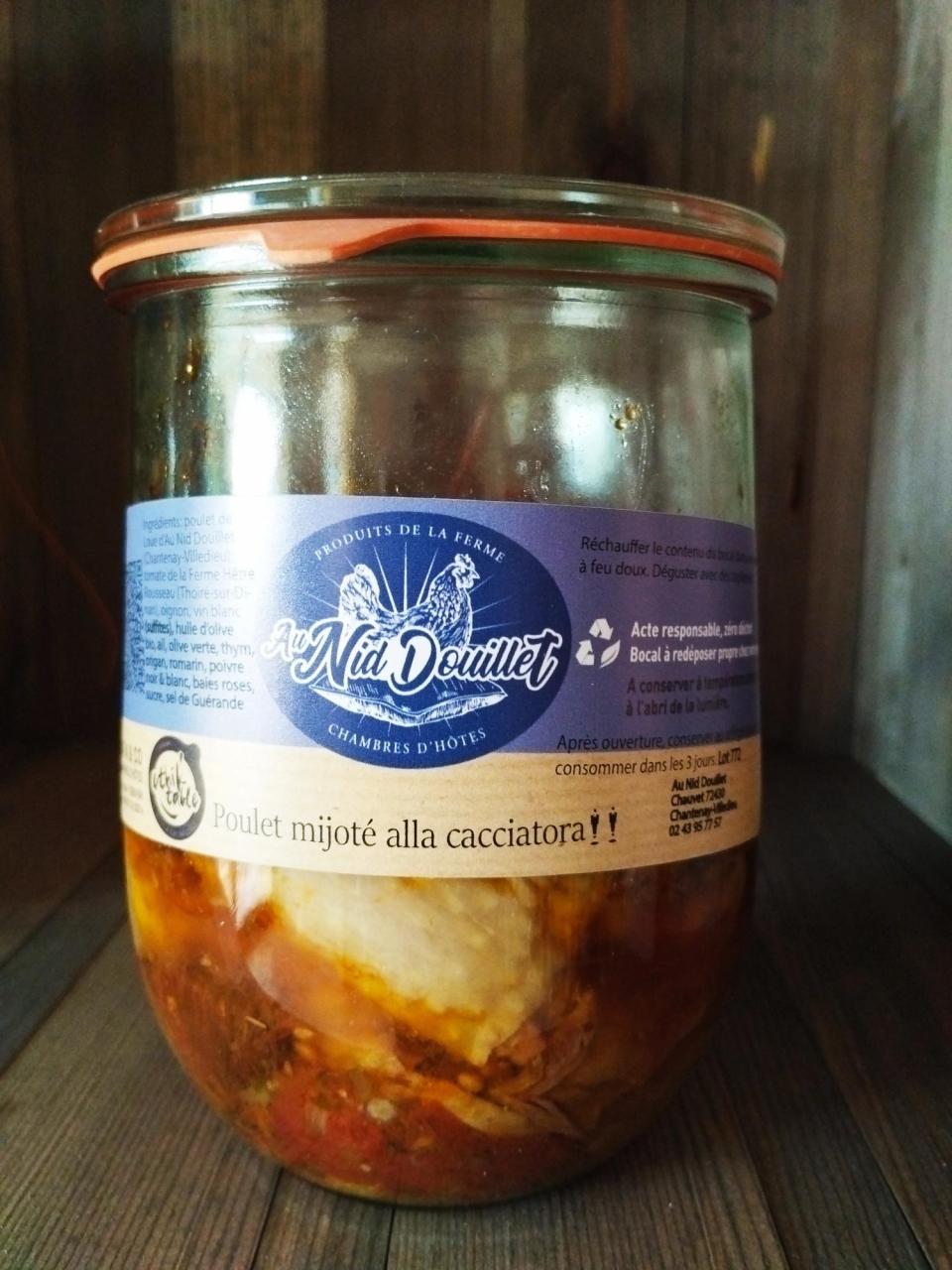 Allergènes : sulfites Conditionnement : bocaux Durée de conservation : jusqu'au 17.08.2025 Ingrédients : Poulet de Loué, tomates, oignon, vin blanc, huile d'olive, ail, olives vertes, thym, origan, romarin, poivre noir et blanc, baies roses, sucre, sel de Guérande. Origine : France