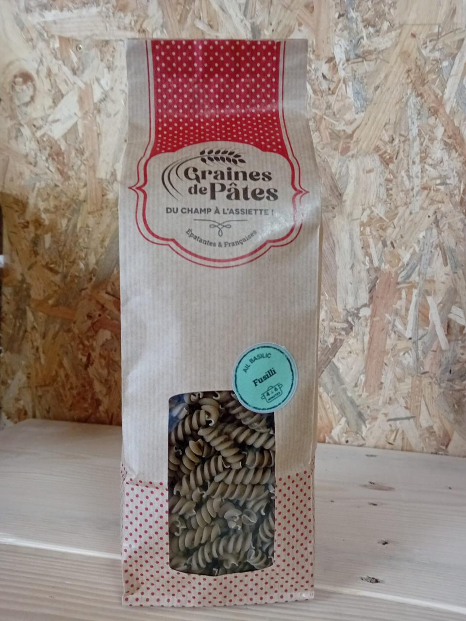 Fusilli ail/basilic 400g. Les Fusilli ail/basilic sublimeront vos plats. Nos pâtes sont fabriquées dans notre atelier de fabrication à base de farine de blé dur cultivé sur notre exploitation. Elles sont séchées lentement à basse température pour en préserver toutes les qualités nutritionnelles, et garantir une bonne tenue à la cuisson.