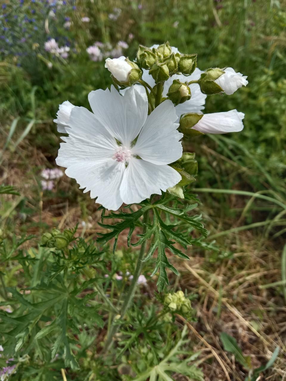 La mauve musquée (Malva moschata) est une plante vivace de durée de vie courte. Ses feuilles sont plus profondément découpées que celles de la mauve sylvestre, et au parfum musqué. Ses fleurs sont roses ou blanches. Toute la plante peut être consommée.