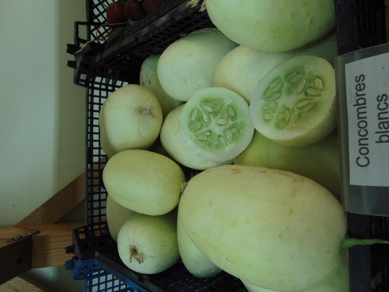 petit concombre rond à peau et chair blanche parfumée , la peau ne se mange pas, produit en agriculture conventionnelle raisonnée