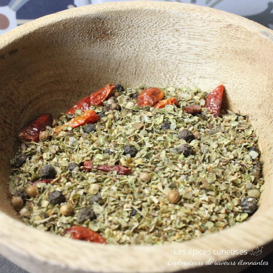 Conditionnement : Sachet Kraft alimentaire Durée de conservation : 2 ans Ingrédients : Origan, marjolaine, basilic, ail, poivre, coriandre, piment oiseau, laurier Origine : NON UE