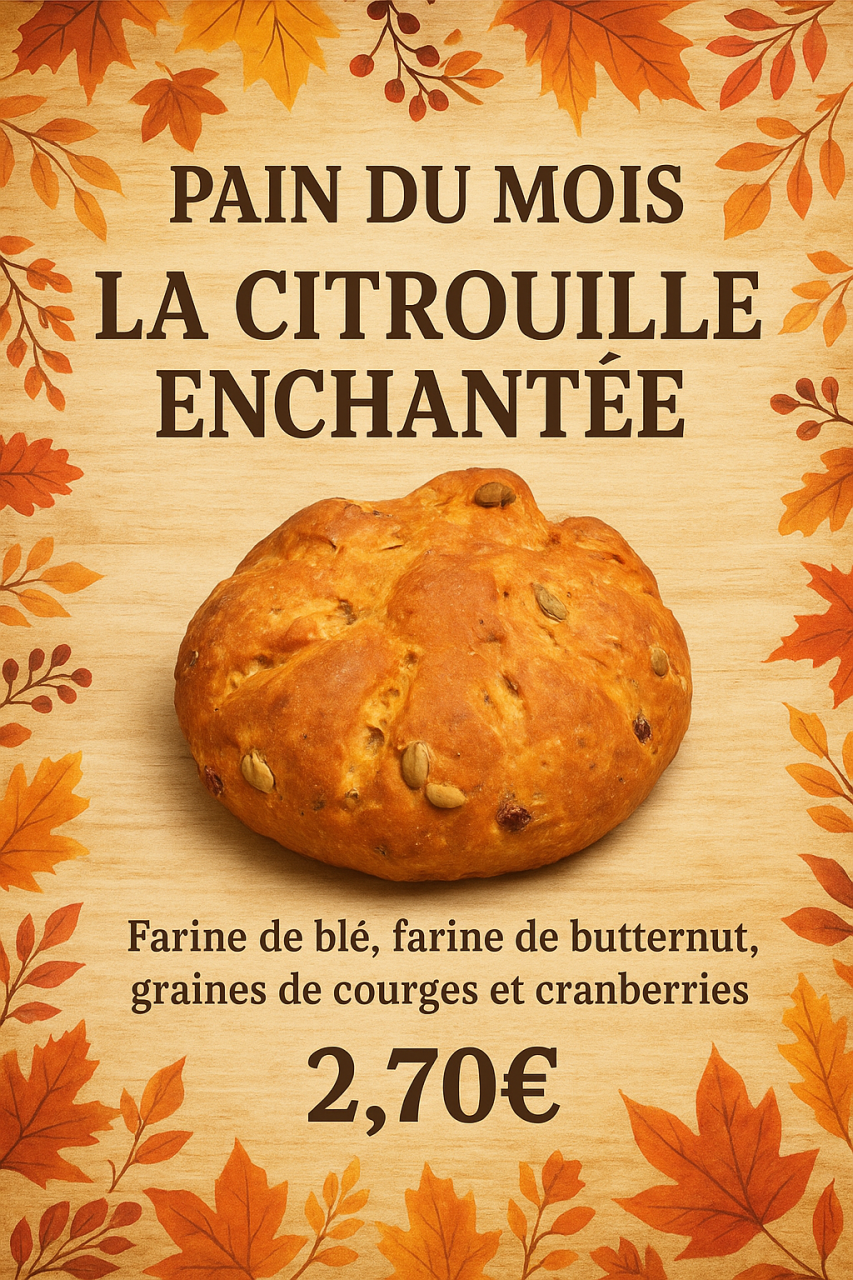 Pour le mois de novembre nous vous proposons un pain à base de farine de blé et farine de butternut, pétri avec des graines de courge, cranberries et graines de de nigel. Il est façonner en forme de citrouille 🎃