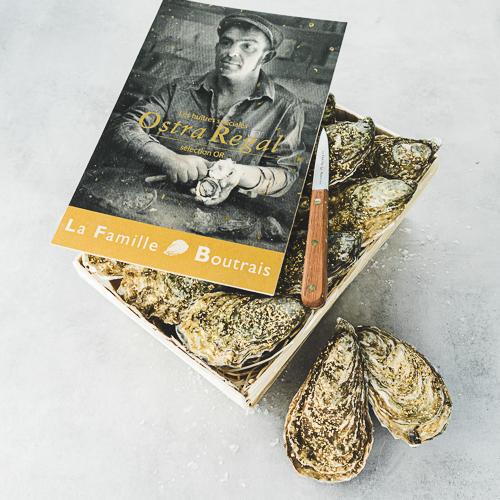La sélection OR Ostra Regal est la quintessence de la production Famille Boutrais, son extraction représente moins de 5% des Ostra Regal élevées chaque année. Saupoudrée de pétales d'or alimentaires 22 carats, la sélection OR est la meilleure des huîtres spéciales de La Famille Boutrais. Sélection des huîtres les plus exposées à la houle, rondes et bombées, annonçant un taux de chair plus élevé.