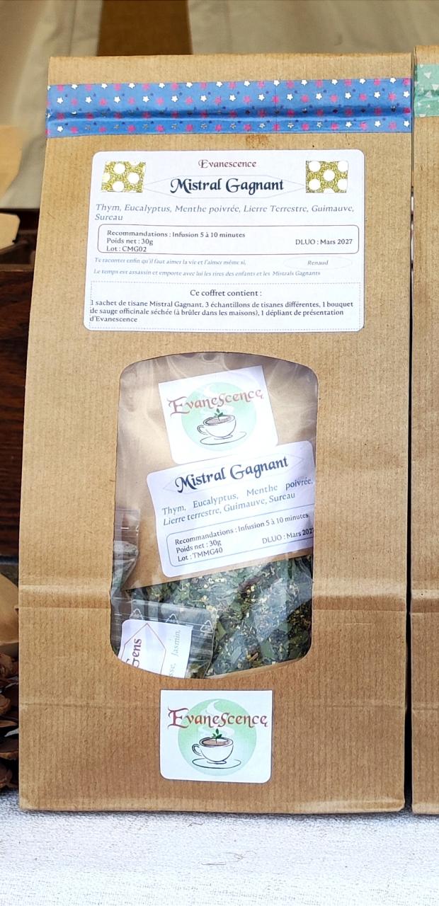 1 sachet de Mistral Gagnant, 3 échantillons de tisanes différentes, 1 bouquet de Sauge séchée à faire brûler dans la maison, 1 dépliant de présentation d'Evanescence