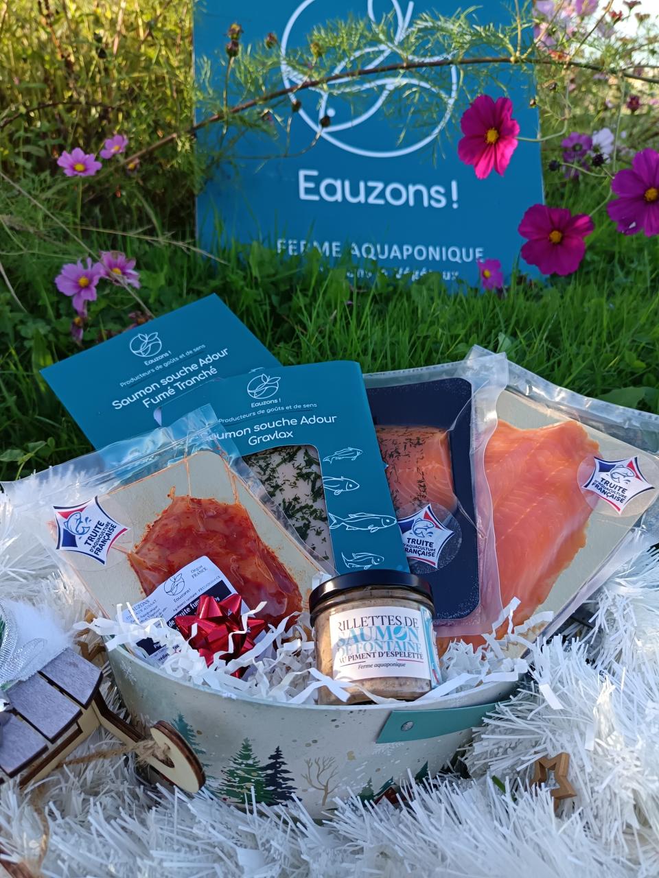 Notre panier Goumand se compose de Saumon de l'Adour fumé tranché, Truite fumée tranchée, de dés de truite fumée au piment d'Espelette AOP, de gravlax de Saumpon de l'Adour à l'aneth et shiso, gravlax de truite à l'aneth, à la menthe ou à la ciboulette ainsi que d'un bocal de rillettes de truite aux herbes et poivre de Timut