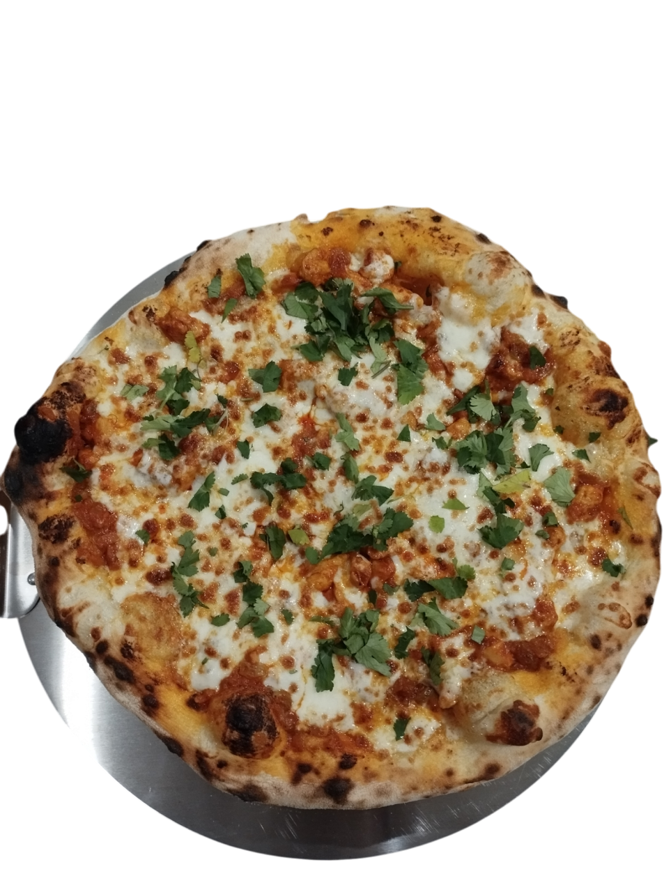Ingrédients : sauce curry maison, mozzarella, poulet curry à la crème de coco, raisin sec, coriandre.